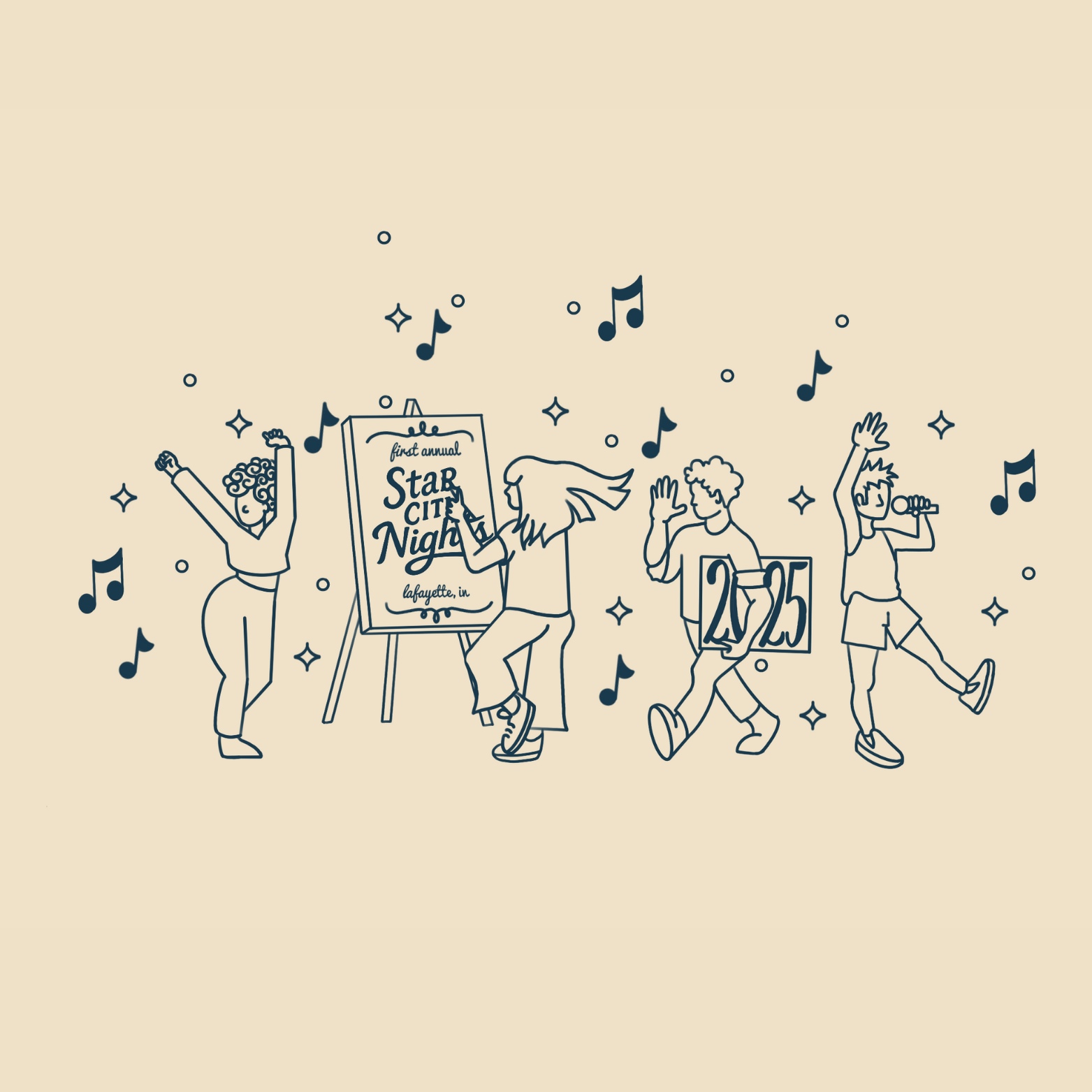Created the featured illustration for the inaugural year of the rebranded Star City Nights festival, capturing the vibrant energy and nighttime magic through playful character design. The artwork will be the visual centerpiece of the 2025 event branding and merchandise. Coming soon to the streets of downtown Lafayette, September 26th…
